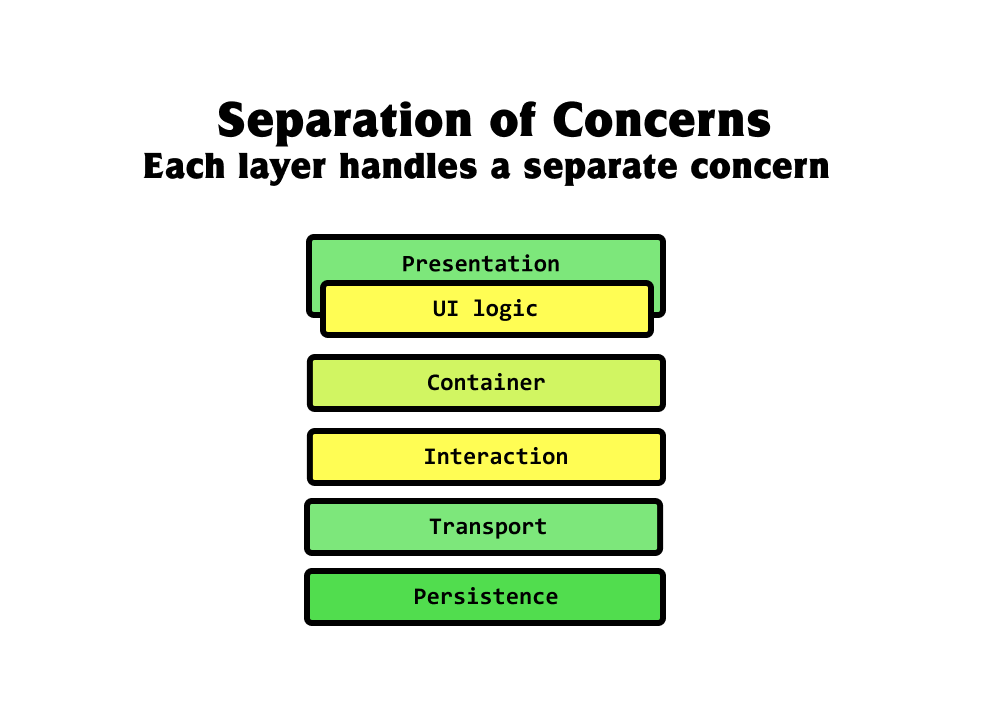 - Container/controller — The glue layer. Connects user events to the correct interaction/application layer construct, and passes reactive data from global storage to presentation components. We can also think of these as page components.