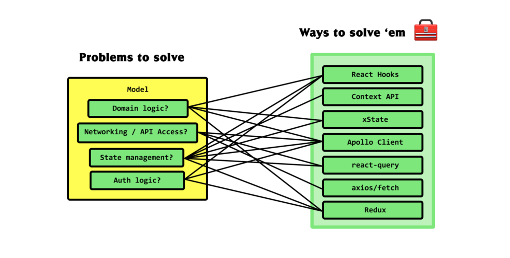 그런데 Stemmler는 MVP가 좋긴 하지만 오늘날에는 너무 포괄적인 면이 있다고 주장한다. 리액트에서 MVC와 MVP의 View와 Controller/Presenter가 presentation component와 container component에 해당하는 건 명백하지만 model을 무엇으로 볼 것인지가 확실치 않다는 것이다. 너무 방대한 개념이 되어버려서 아래 이미지처럼 모델과 도구의 매치가 어려워 진다.